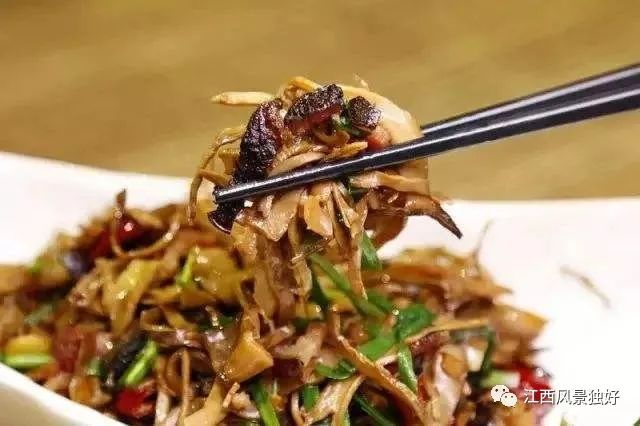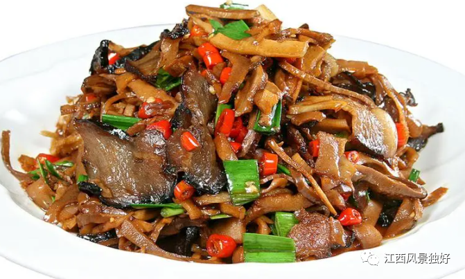 这道菜美味且营养价值高,是由井冈山的特产烟笋和腊肉炒制而成。菜品色泽金黄,质地柔软,品尝后有点小辣微酸,腊味浓重,特别的下饭。