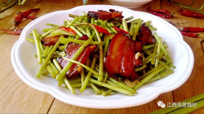 说到腊味,就不得不提到藜蒿炒腊肉。作为南昌的特色名菜,藜蒿炒腊肉属赣菜系豫章菜一支,其主料藜蒿产自中国最大的淡水湖—鄱阳湖,腊肉选用南昌本土特产腊肉。藜蒿炒腊肉以其“脆嫩爽口,醇香柔润”的特点而入选“十大赣菜”之一。