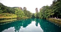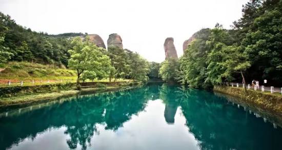 游人可将行李寄存在门口的游客中心再轻装上阵(需付费),乘上观光车直达清水湖码头,沿路可见双龟迎宾、展旗峰。游船是要另付费的,人多拼船比较合算。湖虽不大,但船会带你在湖上逛一大圈才在对面靠岸。在湖心可回望整个龟峰景区,挺拔错落的山体倒映在湖面,天气好的时候阳光照射在山峰上,使得山色红艳,异常迷人。